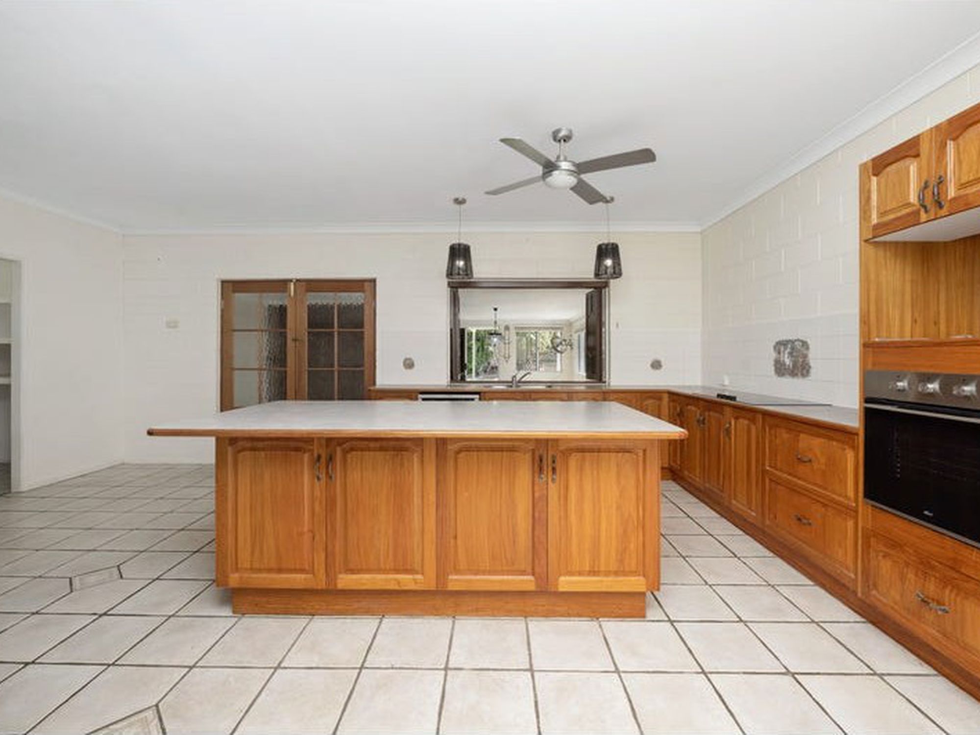 • Oversized kitchen with island bench, wooden cabinetry, and servery to family room