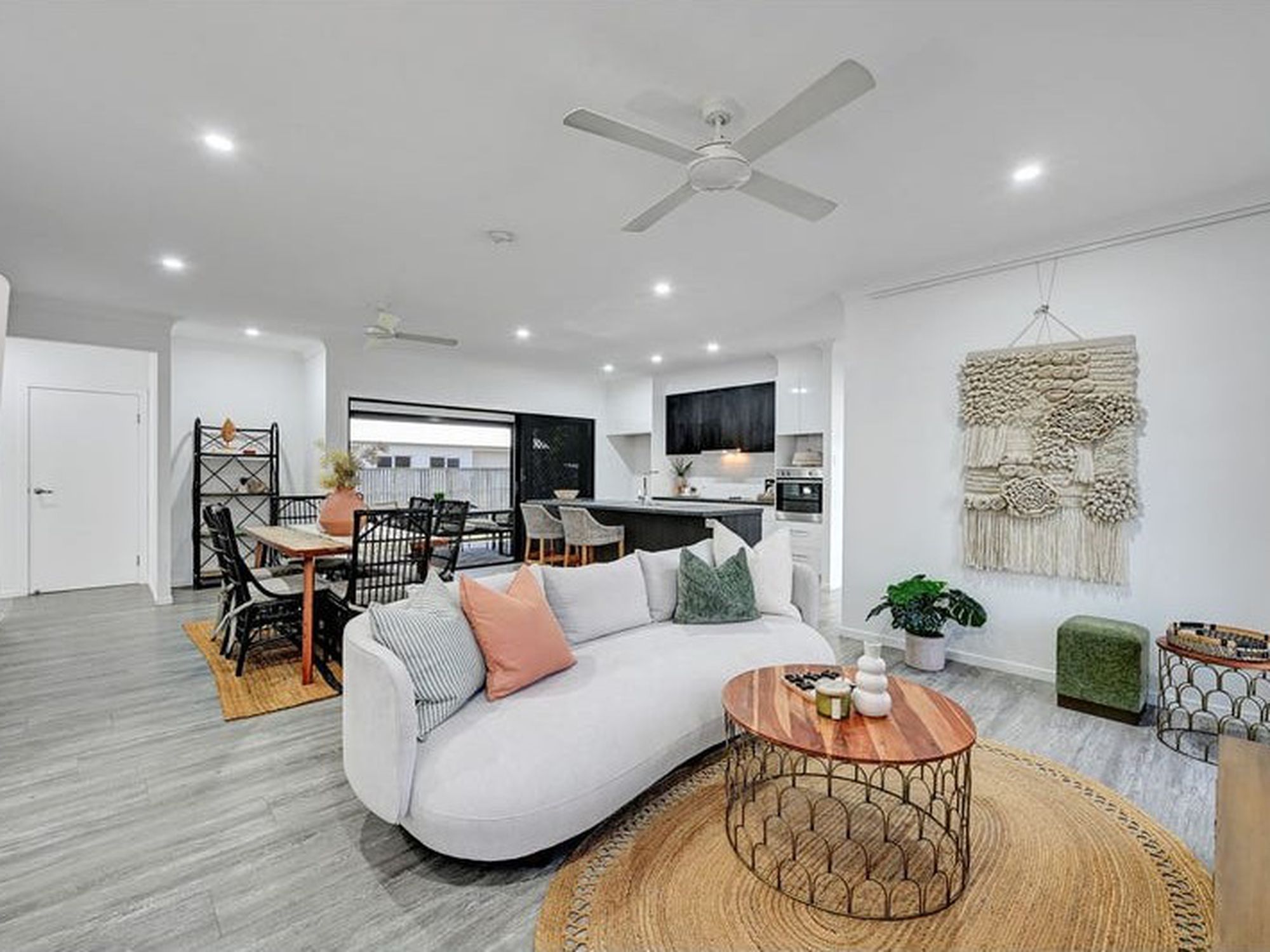 - Open-plan lounge and dining areas featuring a soft, neutral colour scheme
