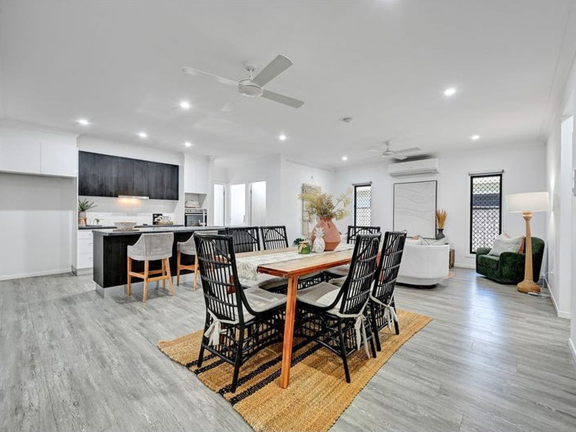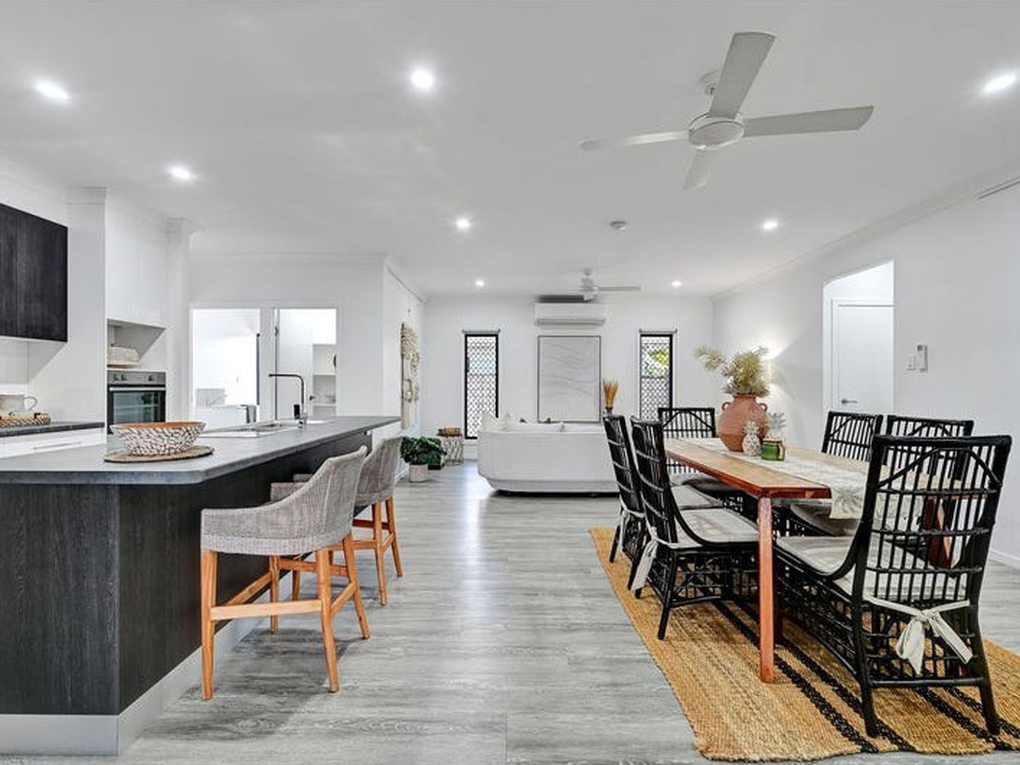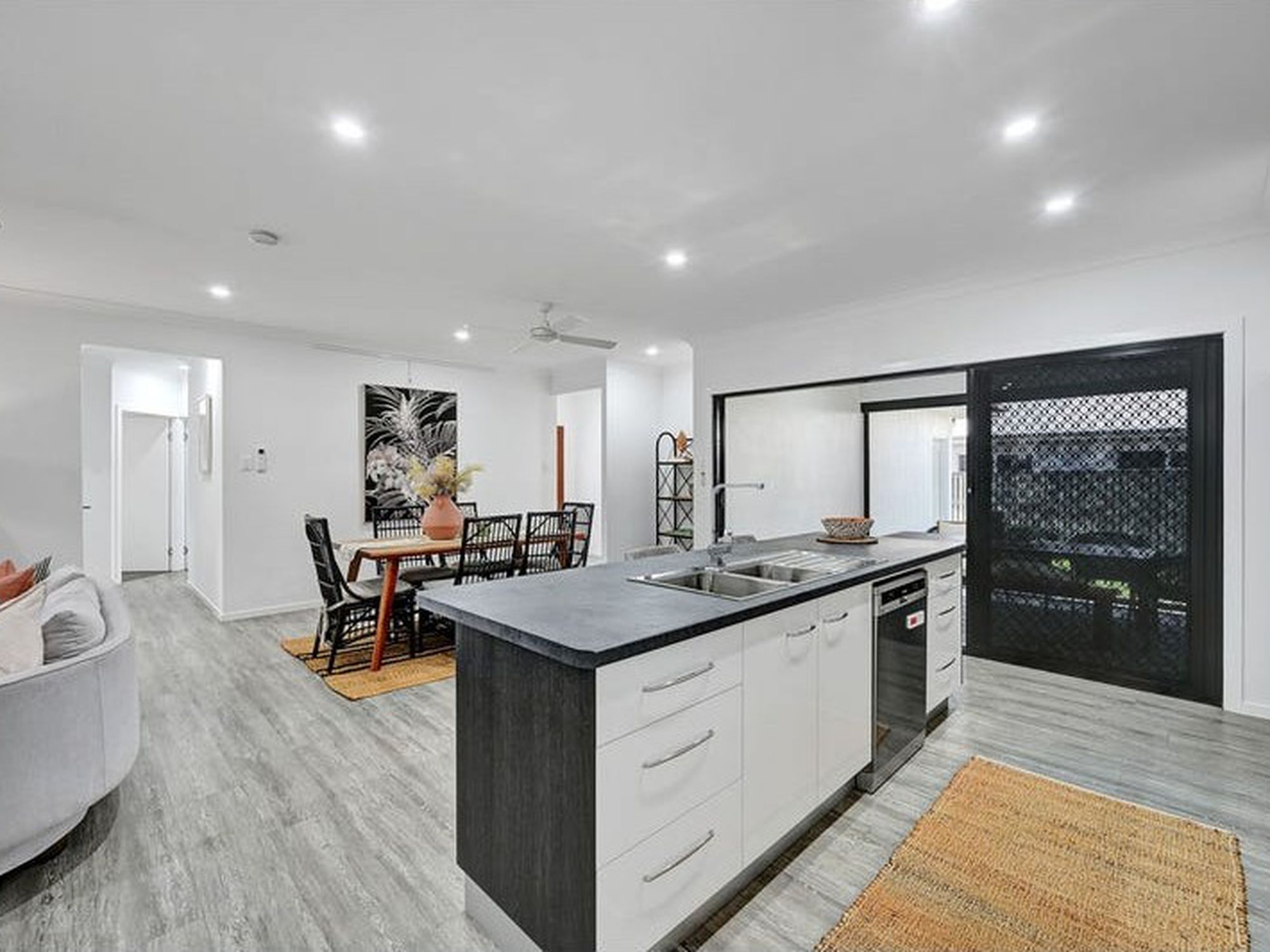 - Timber-look floating floors through living zones for easy care and a modern touch