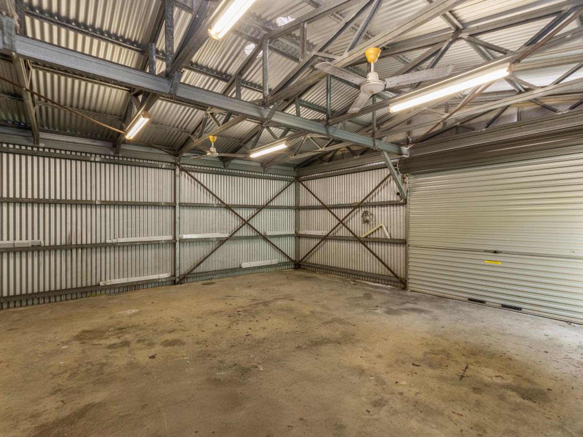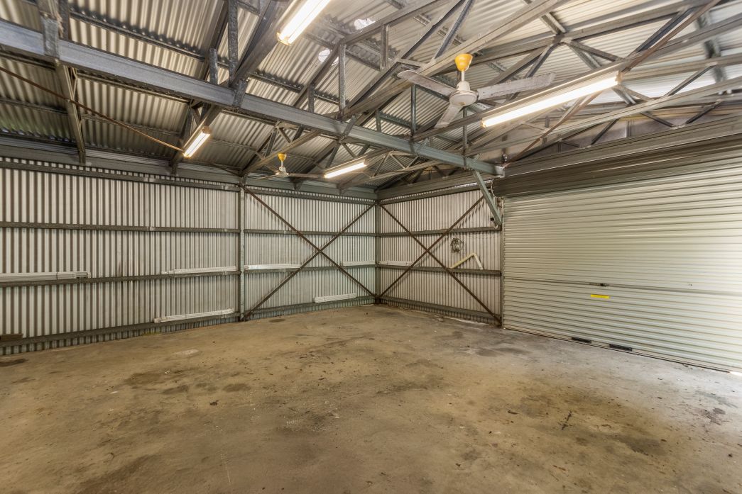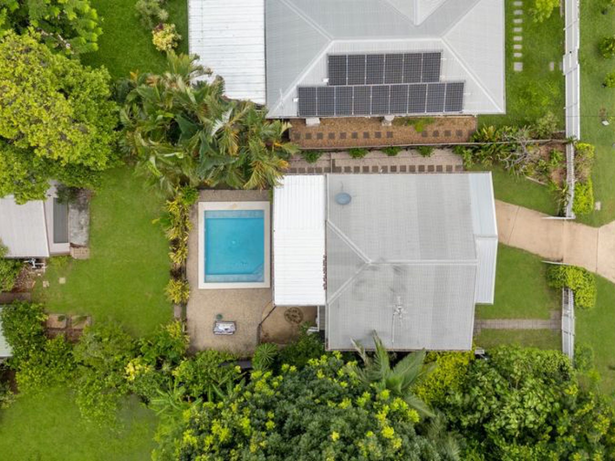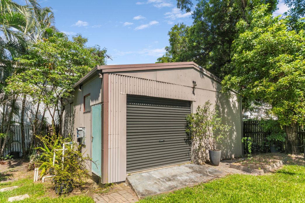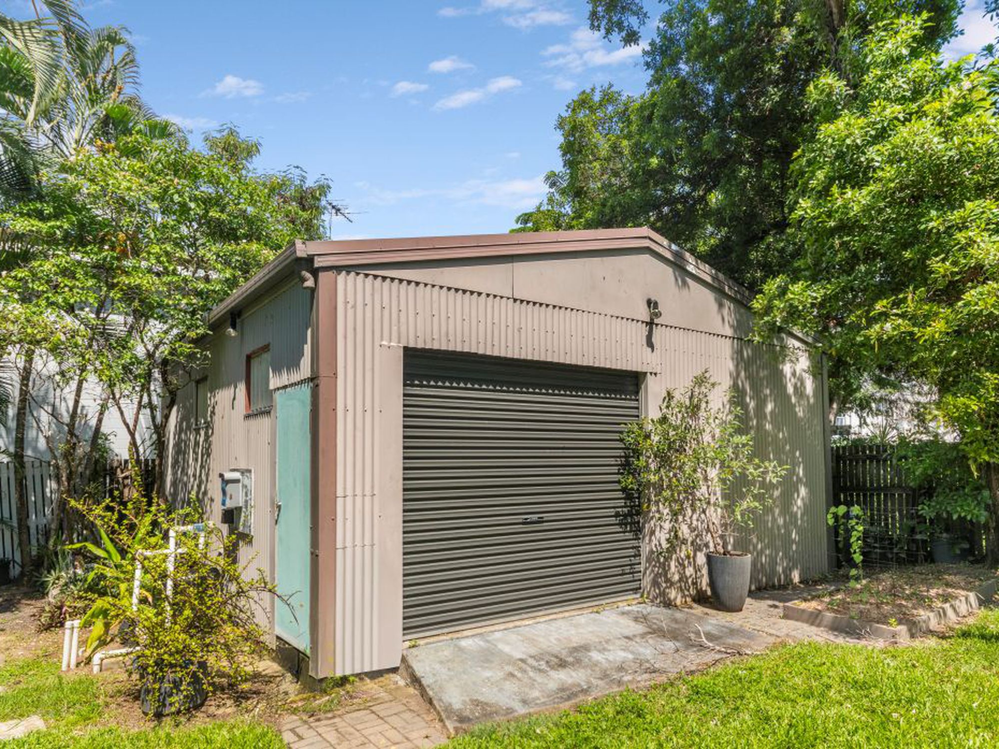 Surrounded by established palms and lush tropical gardens, the backyard creates a peaceful private sanctuary, complete with a dedicated fruit and vegetable patch, a convenient garden shed, and a large powered shed for added storage or workspace.