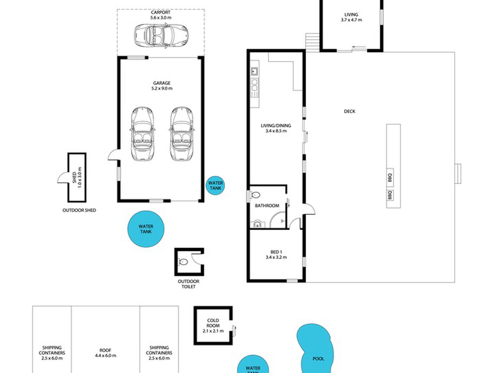 - 2 Bay secure shed plus 1 bay carport for vehicles, machinery or storage